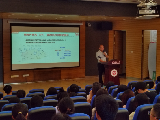 作为公司优秀毕业生代表,张晔博士时隔11年后重返母校。他首先简单介绍了自己,并主要以“细胞外囊泡核酸检测新平台构建及其临床应用转化”为题进行了50分钟的科研讲座;主要从:1)基于DNA框架表面局域化的EV(细胞外囊泡)核酸快速低成本分析技术;2)EV核酸原位检测技术;3)基于微流控技术进行EV单体检测技术等三个方向展开,详细介绍了各自的研究思路及应用和转化——整个讲座深入浅出、逻辑层次分明。随后张晔博士还讲述自己的求学经历,和大家一起回忆求学时的转变、热情工作与科研探索的艰辛。张博士从自己的学历开始讲起,从在tyc33455cc太阳成集团本科期间贪玩游戏到考研过程中幡然醒悟、从研究生阶段开始对科研、对学术研究热情高涨到南方医科大学读博期间就开始组建科研小组,逐步走向顶峰;从后进到新进、从平凡到不平凡,其中的科研热情、提前规划、努力奋斗可以从张博士介绍字里行间中透露出来,引人深思。尤其是张博士从本科阶段挂科生到现在教授级PI的学术成就与科研经历是他自己开心工作与热情生活的一部分,深深引起了本科生和研究生的共鸣与思考。
