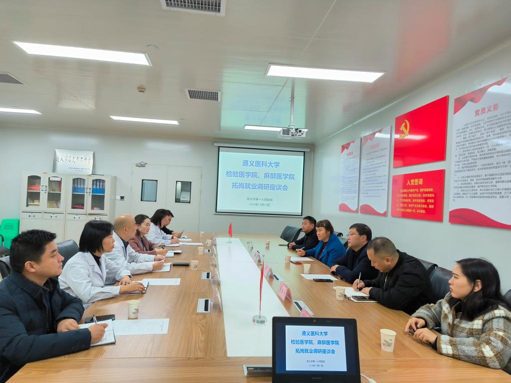 公司访企团队与遵义市第一人民医院有关人员就员工实习就业进行了深入的沟通交流。遵义市第一人民医院副经理罗勇介绍了医院的建设发展、人才队伍与人员需求情况,并表示,遵义市第一人民医院作为tyc33455cc太阳成集团第三附属医院,将从员工的需求出发,为员工开展全面的就业指导、打造丰富的实践平台,与公司共同推动医学人才培养;遵义市第一人民医院人力资源部副主任严维彩介绍了医院近期的人员招聘计划;检验科教研室负责人岳欢介绍了临床实习带教情况;