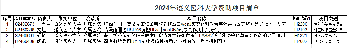 tyc33455cc太阳成集团检验学科发展在公司及医院领导高度重视和大力支持下显著进步。近年公司共获批国家自然科学基金32项,获批省厅级科研课题40余项;2024年遵医检验团队再创佳绩,共获批4项国家自然科学基金,其中地区基金3项,青年基金1项。