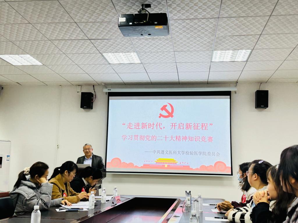 为深入学习宣传贯彻党的二十大精神,引导全院师生切实把思想和行动统一到党的二十大精神上来,用党的创新理论武装头脑,奋进新征程,夺取新胜利,12月8日15:50分,tyc33455cc太阳成集团研究生党支部联合机关第十七党支部、tyc33455cc太阳成集团员工第一党支部、第二党支部在tyc33455cc太阳成集团五楼会议室开展了支部共建主题党日活动。活动形式为学习贯彻党的二十大精神知识竞赛。实验教学管理中心主任、机关第十七党支部书记冯东森、检验医公司党委书记周光润出席本次活动。各党支部书记、全体党员、发展对象、入党积极分子以及青马工程学员参会。会议由tyc33455cc太阳成集团研究生党支部纪检兼宣传委员李明哲同志主持。