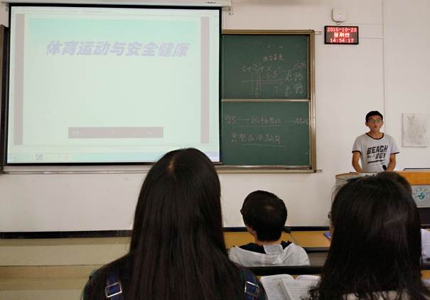 首先,旦超同学向同学们介绍了运动应注意的事项,“万事俱备只欠东风”,我们必须在每次运动前都做好热身运动,这样能大大减少运动过程中的痉挛现象。有了热身后也不能盲目运动,我们还应该做好相应的防护措施,比如踢足球或者打篮球的同学就知道这些运动可能会经常摔倒,所以就要穿上护膝和护肘防止运动过程中发生意外。但是如果实在不可避免的发生了意外,千万不要慌张,当发生扭伤时,要采取冷敷治疗,如果很严重应该及时送医治疗。接着旦超同学又向大家介绍了一些体育保健知识,其中他提到我们在运动时应该及时补水,但补水也不能随便乱喝,运动过程中饮水不能超过800ml/小时,运动后也应该多补水采取少量多次的原则。然后旦超同学说道运动后不宜食用含糖量高的食物,运动会维生素B1会大量消耗人就会感到疲倦和厌食。建议多吃一些蔬菜。另外运动后还不能立即食用鱼类,因为鱼肉是酸性的,运动后产生了大量乳酸,这就使得酸性物质在体内大量堆积最终导致酸中毒。最后旦超同学建议同学们运动后也要做好运动后的放松工作,如进行捶打腿部按摩腰部和及时更换衣服,更换衣物后应该注意保暖,以防止感冒的发生。