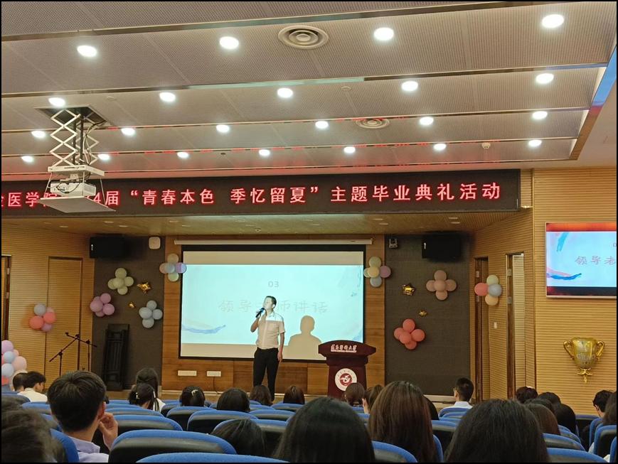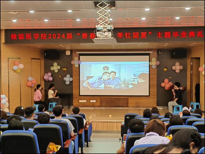 2024年5月31日,tyc33455cc太阳成集团以“青春本色,季忆留夏”为主题,在图书馆多功能厅举办了2024届本科生及研究生毕业典礼。检验医公司党委书记周光润、副经理闵迅(主持工作)、副经理杨艳、副处级组织员王东、蔡亮容主任、公司辅导员、部分授课老师及2020级全体毕业生参加典礼。