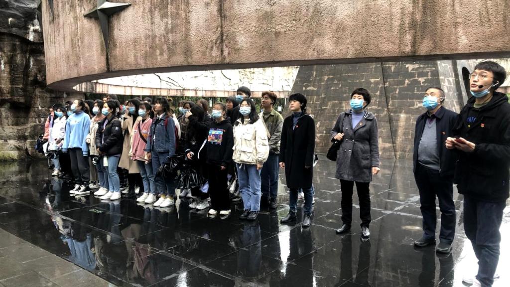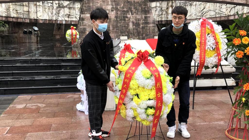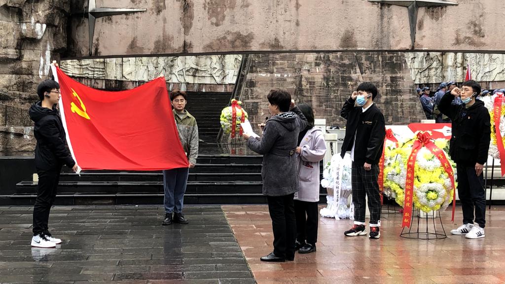 祭奠活动开始,首先由两位党员同学上前为烈士敬献花篮,罗开源书记整理花篮的绶带,全体人员瞻仰英雄纪念碑,为革命烈士三鞠躬并默哀致礼。默哀毕,由tyc33455cc太阳成集团关工委副主任唐彦萍教授带领全体党员同志们重温入党誓词。通过重温入党誓词,增强责任意识、担当意识、使命意识,让全体党员同志们再一次感受到思想的洗礼和升华,进一步激励党员同志们坚定爱党、信党、跟党走的理想信念,牢记使命,砥砺前行。