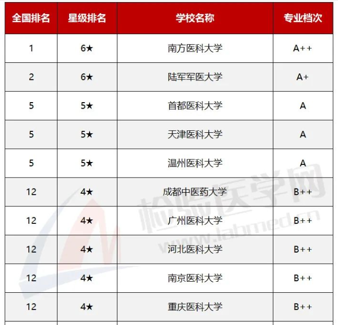 员工会2022中国医药类大学医学一流专业排名-医学检验技术(研究型)