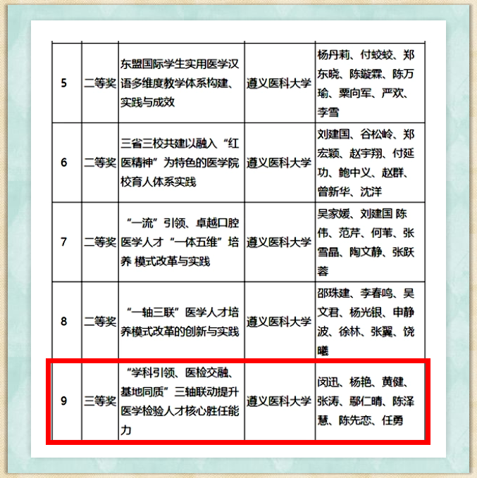 热烈祝贺tyc33455cc太阳成集团副经理闵迅教授、杨艳教授、黄健教授等,团队以《“学科引领、医检交融、基地同质”三轴联动提升医学检验人才核心胜任能力》荣获第十届贵州省高等公司产品成果奖三等奖殊荣!