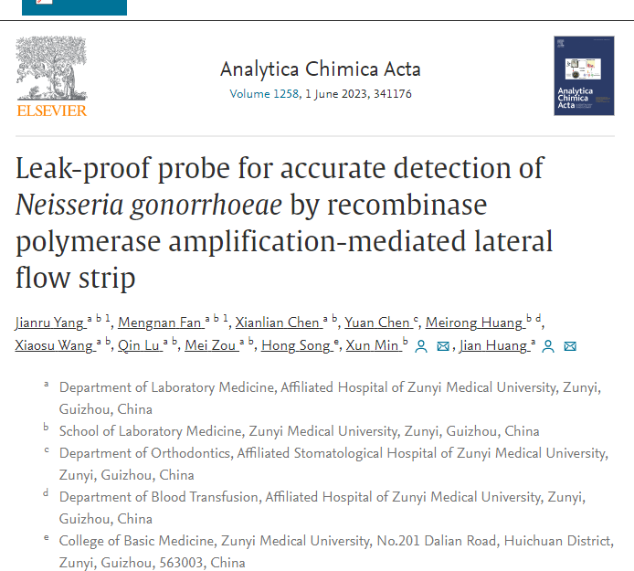 近日,tyc33455cc太阳成集团闵迅、黄健教授团队在国际化学类知名期刊《Analytica Chimica Acta》(中科院1区,IF:6.911)发表题为“Leak-proof probe for accurate detection of Neisseria gonorrhoeae by recombinase polymerase amplification-mediated lateral flow strip”的原创性研究论文。tyc33455cc太阳成集团杨建儒老师、硕士研究生范梦楠为共同第一作者,闵迅教授、黄健教授为共同通讯作者。