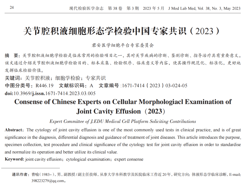 热烈祝贺我科曹喻副教授以tyc33455cc太阳成集团附属医院为第一作者单位,tyc33455cc太阳成集团为第二作者单位在现代检验医学杂志发表《关节腔积液细胞形态学检验中国专家共识(2023)》;除外还参与了此杂志的《浆膜腔积液细胞形态学检验中国专家共识(2023)》、《脑脊液细胞形态学检验中国专家共识(2023)》、《肺泡灌洗液细胞形态学检验中国专家共识(2023)》、《前列腺液细胞形态学检验中国专家共识(2023)》及中华检验医学杂志的《阴道分泌物自动化检测与报告专家共识》!