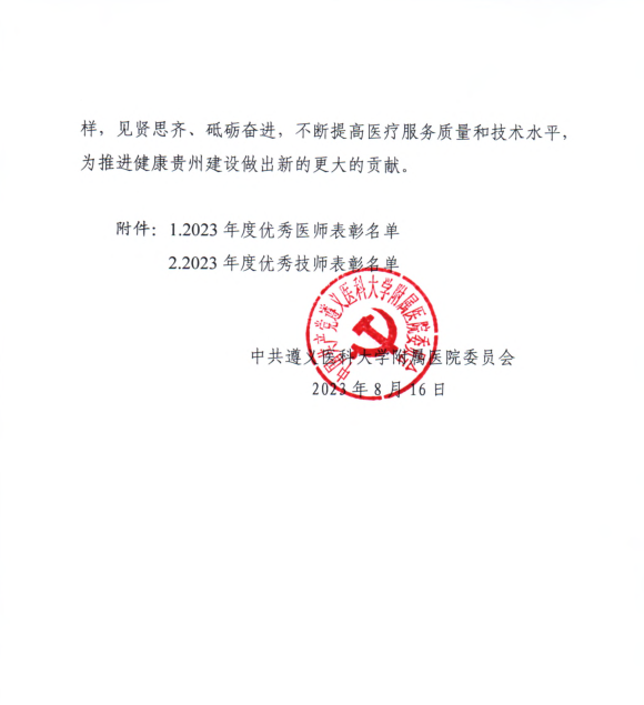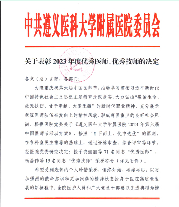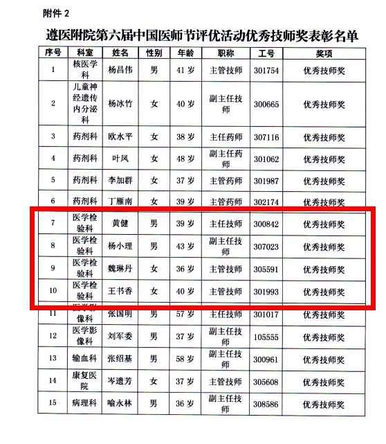 热烈祝贺tyc33455cc太阳成集团附属医院医学检验科黄健教授、杨小理副教授、王书香、魏琳丹老师荣获2023年度优秀技师荣誉!