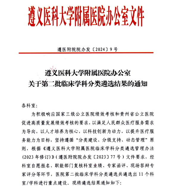 为积极响应国家三级公立医院绩效考核和贵州省公立医院促进高质量发展绩效考核的要求,以满足人民群众医疗服务需求为导向,以人才培养为核心,以科技创新为动力,以提升医疗服务能力为目标,坚持遵循“分类建设、分级支持、动态管理”原则,根据《tyc33455cc太阳成集团附属医院临床学科分类遴选管理办法(2023年修订)》(遵医附院院办发〔2023〕77号)文件要求,经科室自愿报名、职能部门复核科室业绩、专家函评、现场答辩专家评分等环节,医院第二批临床学科分类遴选共遴选出11个科室/学科进行重点建设。