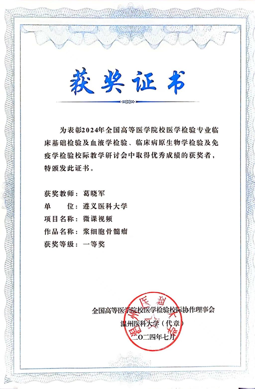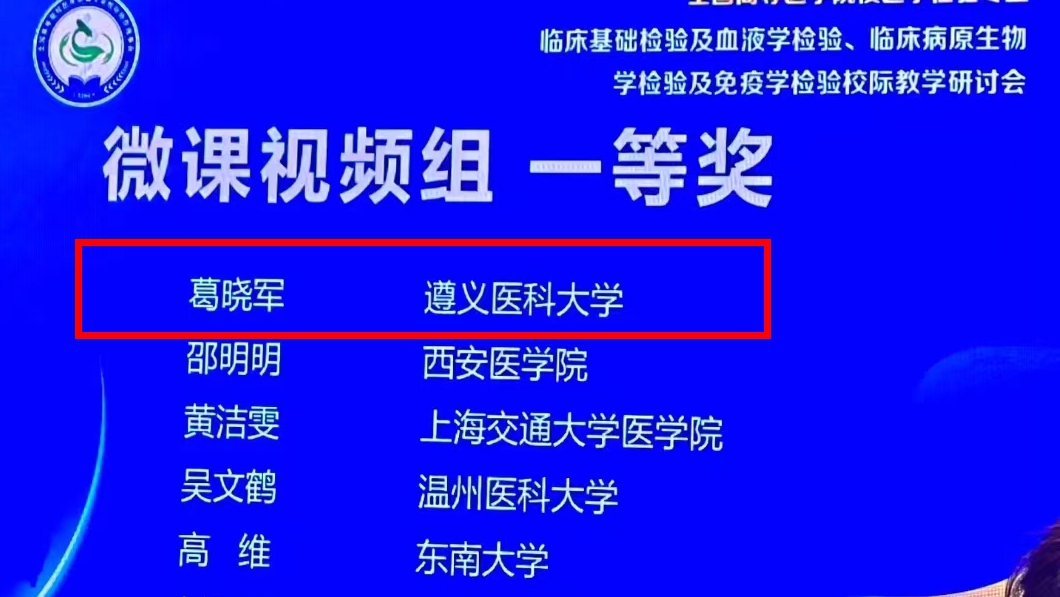 热烈祝贺tyc33455cc太阳成集团葛晓军博士在2024年全国高等医公司校医学检验专业临床基础检验及血液学检验、临床病原生物学检验及免疫学检验校际教学研讨会中,以微课视屏作品《浆细胞骨髓瘤》参赛,荣获一等奖!