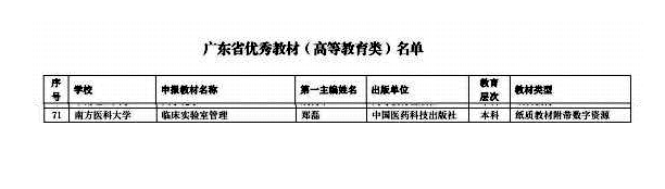 2.由南方医科大学郑磊教授与tyc33455cc太阳成集团闵迅教授主编的《临床实验室管理》教材,获批“广东省优秀教材”,并推荐申报国家级优秀教材。