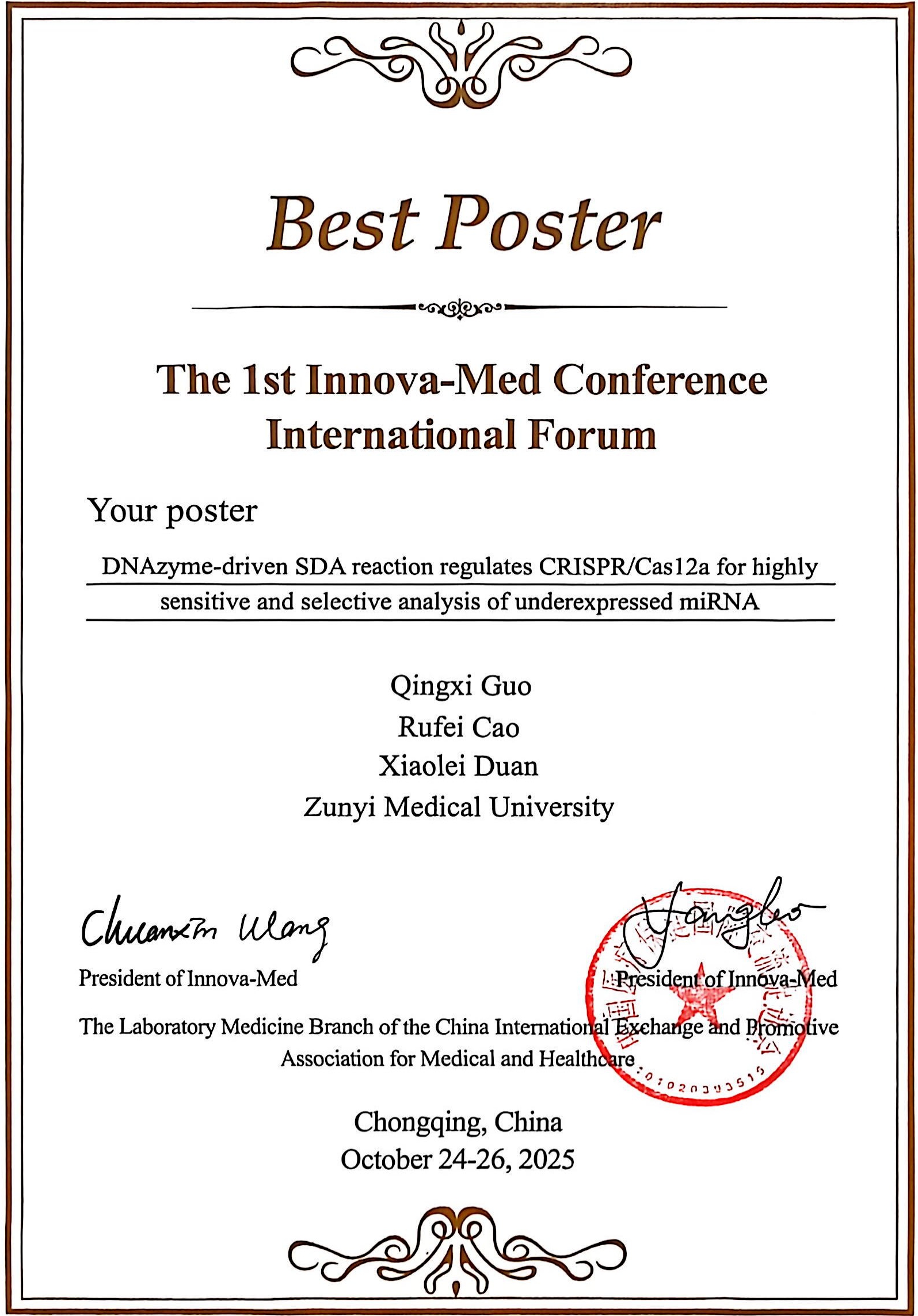 2、郭清晰、曹汝菲、段晓雷团队凭借海报《DNAzyme驱动的SDA反应调控CRISPR/Cas12a用于低表达miRNA的高灵敏选择性分析》,荣获“最佳海报奖”。