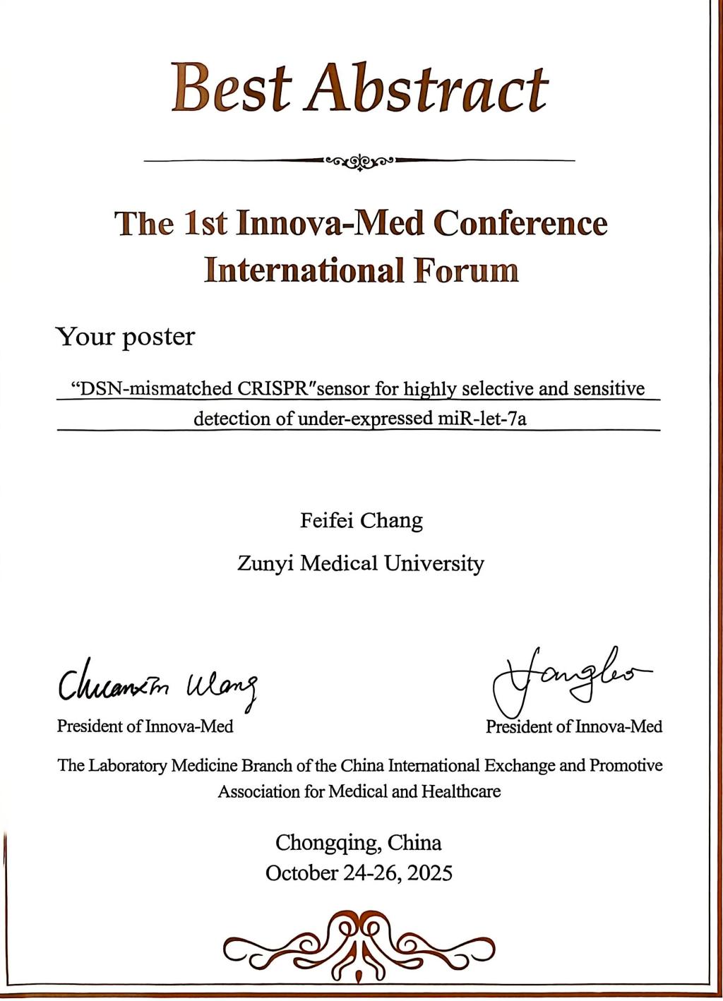1、常飞飞同学凭借其研究项目《DSN-mismatched CRISPR传感器用于低表达miR-let-7a的高选择性灵敏检测》,荣获“最佳摘要奖”;