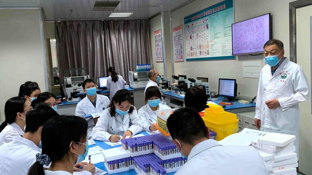 张立文教授对临检血液组工作人员进行现场考核