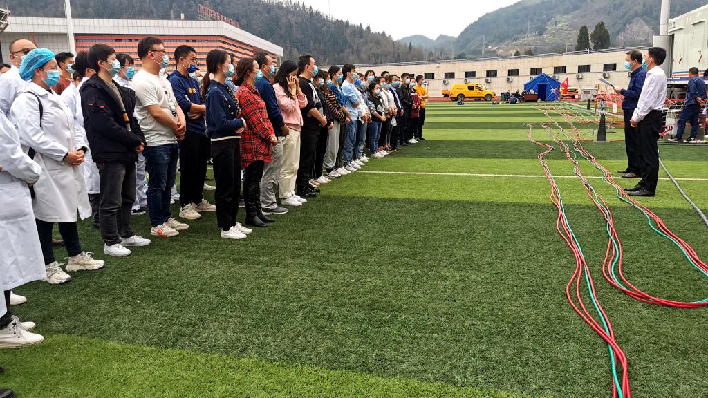 3月12日中午到达务川县体育场后,所有队员来不及休息立即展开场地布置和组织召开动员会,并对抗疫工作进行了细致的分工和部署。由魏在荣副经理担任总指挥,任命闵迅主任为现场指挥,肖代敏、马庆庆共同担任质量和技术主管,向加林担任协调及信息保障组组长,黎兵担任后勤保障组组长,杨小理担任前处理组组长,王勰担任生物安全组组长,并任命黎兵、郑国波、田地分别担任3辆火眼移动式检测车车长,各轮班次共配置9名组长,以满足移动实验室质量和技术相关要求。