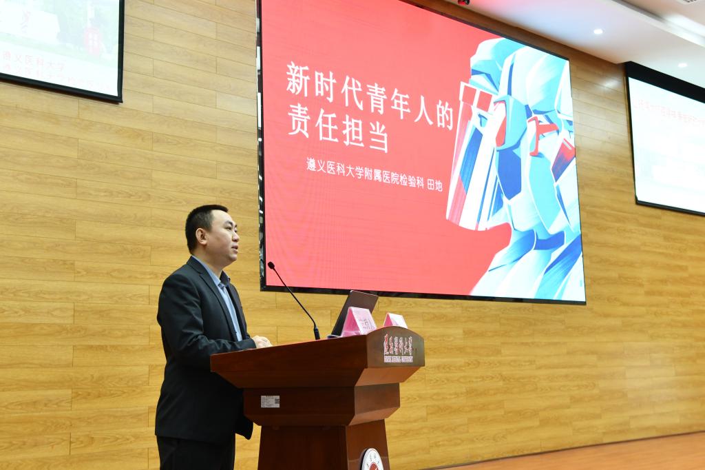 其次,作为抗疫一线工作人员代表,遵医附院医学检验科老师田地作了题为“新时代青年人的责任担当”的发言。田地老师说,面对来势汹汹的贵阳、毕节疫情,遵医附院检验团队闻令而动,“疫”往无前,充分发挥了党支部的战斗堡垒和党员干部的先锋模范作用,让党旗在战“疫”一线高高飘扬。田地老师提到,为做好质量控制,检验团队在每班次工作前都会强调操作细节,每班次工作结束后都会及时总结。面对繁重的检测工作,检验团队总是迎难而上,争分夺秒,昼夜奋战。