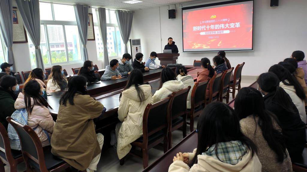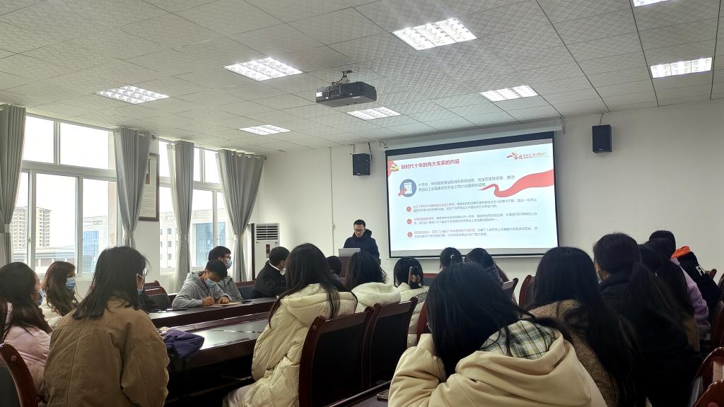 为深入学习宣传贯彻党的二十大精神,使同学们深刻领会新时代十年的伟大变革,tyc33455cc太阳成集团于2022年12月5日中午13:00在tyc33455cc太阳成集团(新蒲校区)tyc33455cc太阳成集团会议室开展了以“新时代十年的伟大变革”为主题的宣讲活动,本次活动由tyc33455cc太阳成集团辅导员张增平老师领学,21级3班全体团员参加。
