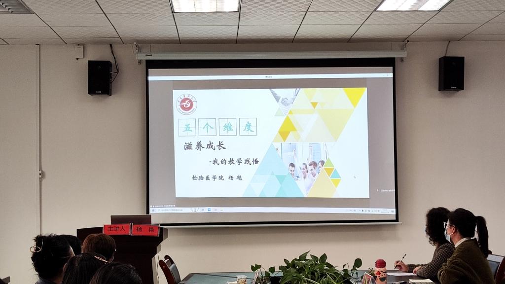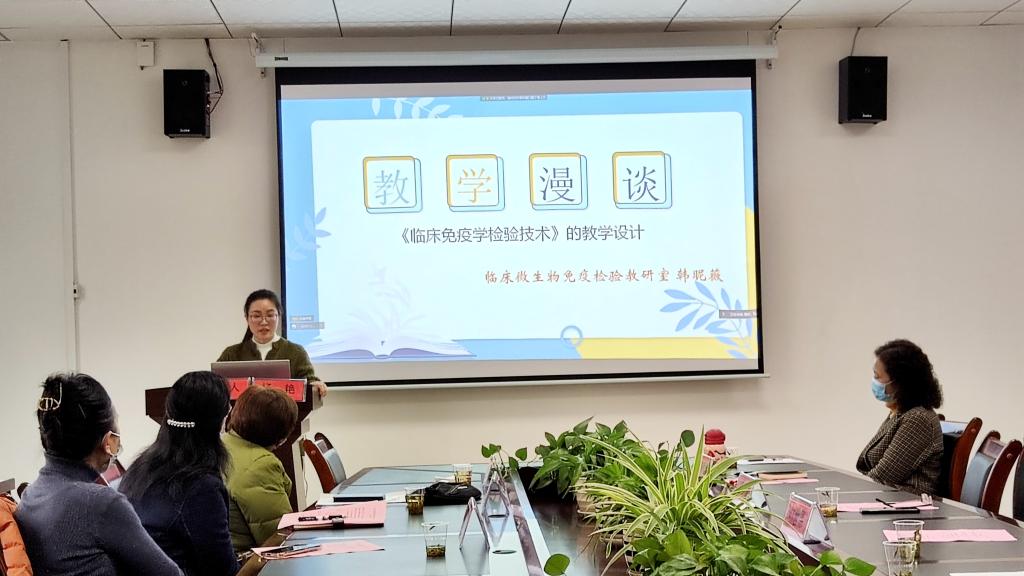 杨艳老师从“五个维度”分享了自己的教学践悟。杨老师勉励青年教师要牢记初心,提升心境,做一个终身学习者、分享者,做一个有“灵魂”的教学设计者。杨老师认为,教学能力的提升是循序渐进的过程,青年教师应苦练教学基本功,掌握教学方法,善用思维导图。韩昵薇老师以“教学漫谈—《临床免疫学检验技术》的教学设计”为主题作了分享。韩老师认为,课堂设计不仅要重视教师的教,更要重视员工的学。要根据员工具体情况精心设计教学,让员工在做中学、在研究中体会学习的快乐。