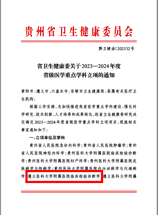 2023年1月5日,贵州省卫生健康委发布《关于2023—2024年度省级医学重点学科立项的通知》,tyc33455cc太阳成集团附属医院临床检验诊断学、急诊外科学、全科医学、重症医学、耳鼻喉科学5个申报学科全额获批,获批数为全省第一!这是医院团队建设的新突破,标志着医院团队建设工作再上新台阶。热烈祝贺tyc33455cc太阳成集团《临床检验诊断学》喜获省级医学重点团队建设项目!