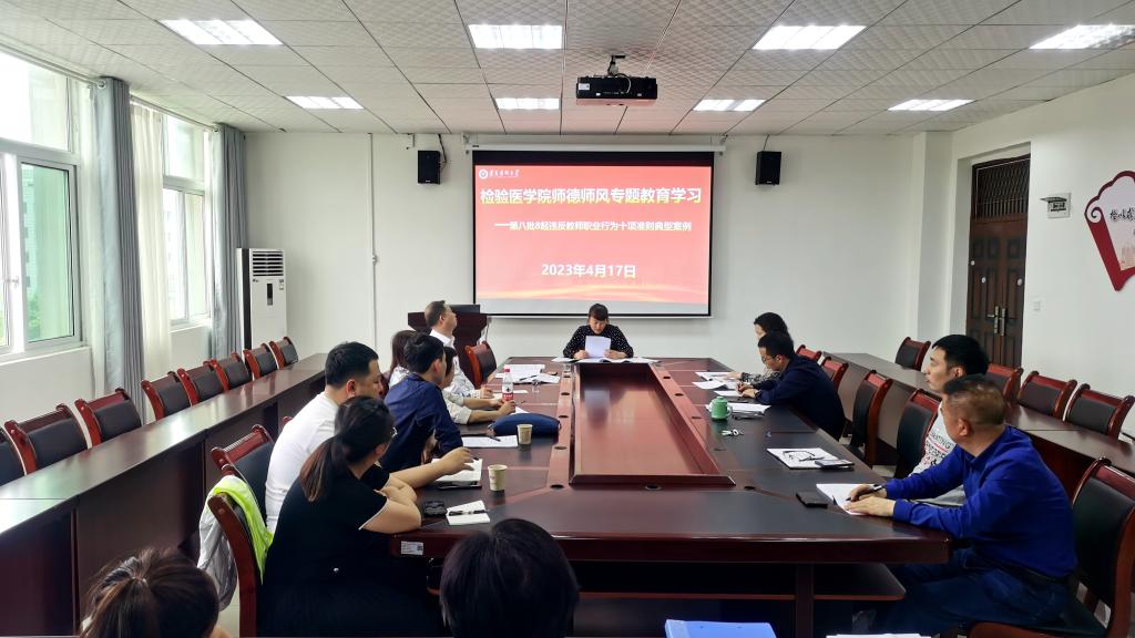为深入贯彻落实党的二十大精神,认真学习贯彻习近平总书记关于师德师风建设的重要指示精神,建设一支师德高尚、业务精湛、结构合理、充满活力、适应多彩贵州新未来发展需要的高素质专业化创新型教师队伍。tyc33455cc太阳成集团于2023年4月17日下午在新蒲校区公司会议室组织开展了师德师风专题教育学习。检验医公司党政领导班子成员、各教研室主任、课程组长、教学秘书、辅导员、新蒲全体教师参加学习。检验医公司党委书记周光润主持。