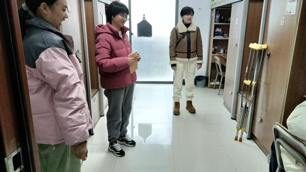 公司从寝室用电安全、管制刀具排查、寝室卫生保洁、员工文明礼貌等方面对全院寝室检查评分,对于发现的问题当场指出,并要求员工立即整改。查寝中,老师们反复提醒员工注意冬季防寒防冻,防范电信网络诈骗,指导同学们整理内务、合理使用空调,对员工提出的问题耐心解答。