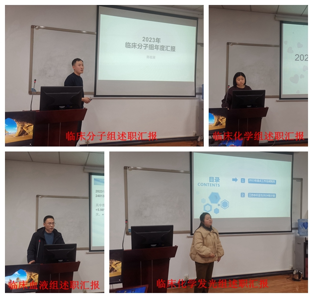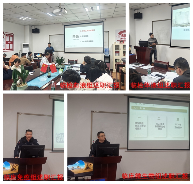 随后,10名科级干部分别就所分管的工作情况内容、个人履行岗位职责情况,包括德、能、勤、绩、廉等方面内容、工作不足和2024年工作计划进行汇报;8名各专业组组长分别就ISO15189分管工作、新技术新项目开展情况、室间质评和室内质控、工作量及成本效益、外出培训学习交流情况、科研论文及教学情况、新年工作计划等方面展开现场汇报;5名综合组组长依次就本职工作完成情况、工作中出现的问题及新年工作计划等三方面来展开汇报。