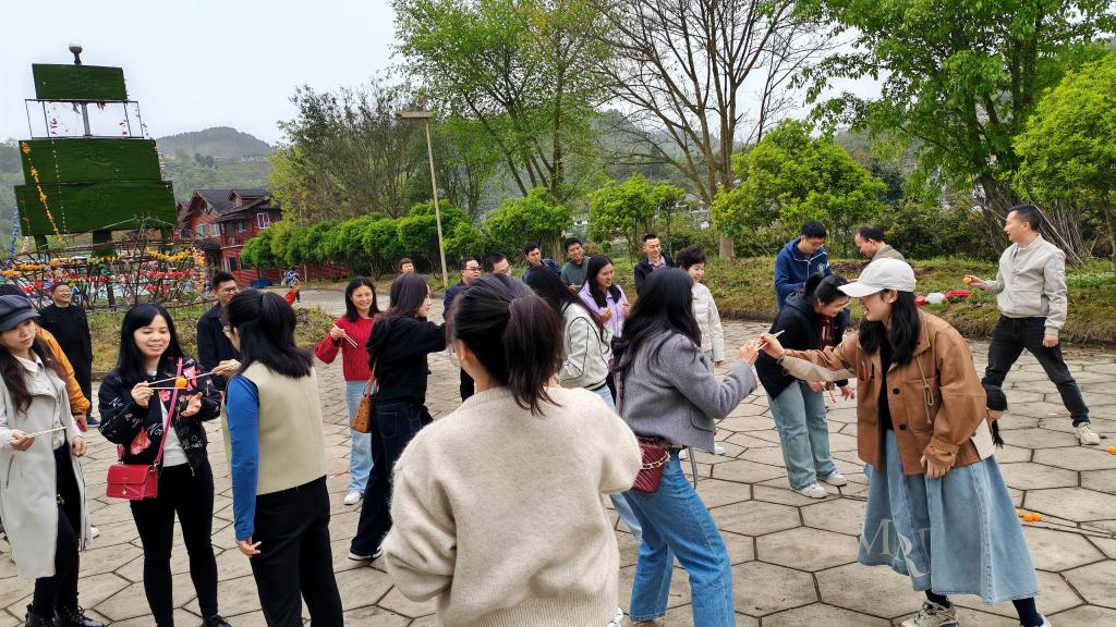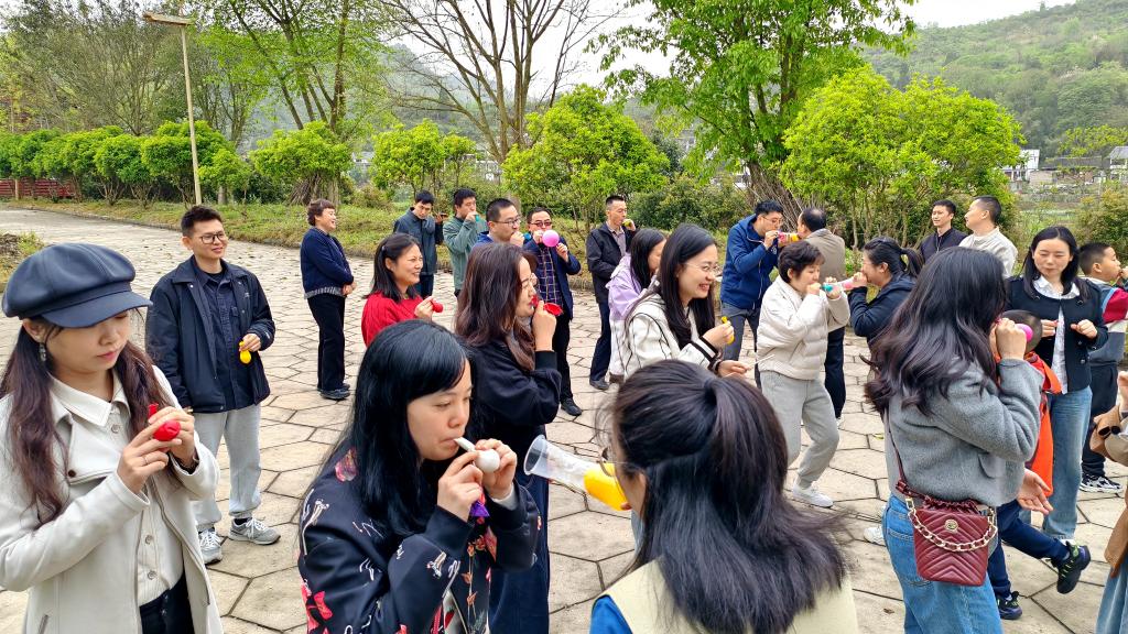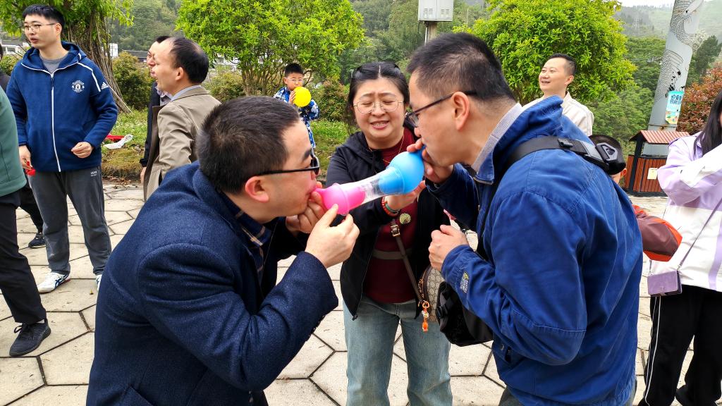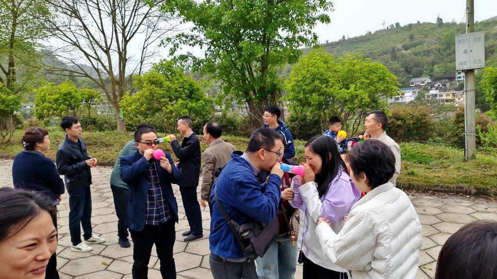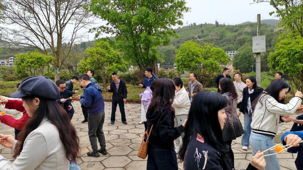 午后,工会精心组织了系列团建活动。在"健步走"环节中,大家漫步乌江畔,感受春日美景;"筷子传乒乓球竞速赛"考验团队默契,欢笑不断;"气球传杯子争先赛"更是将活动推向高潮。教职工们热情参与,在竞技与合作中展现出昂扬向上的精神风貌。