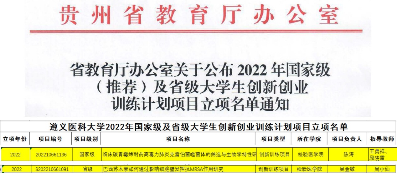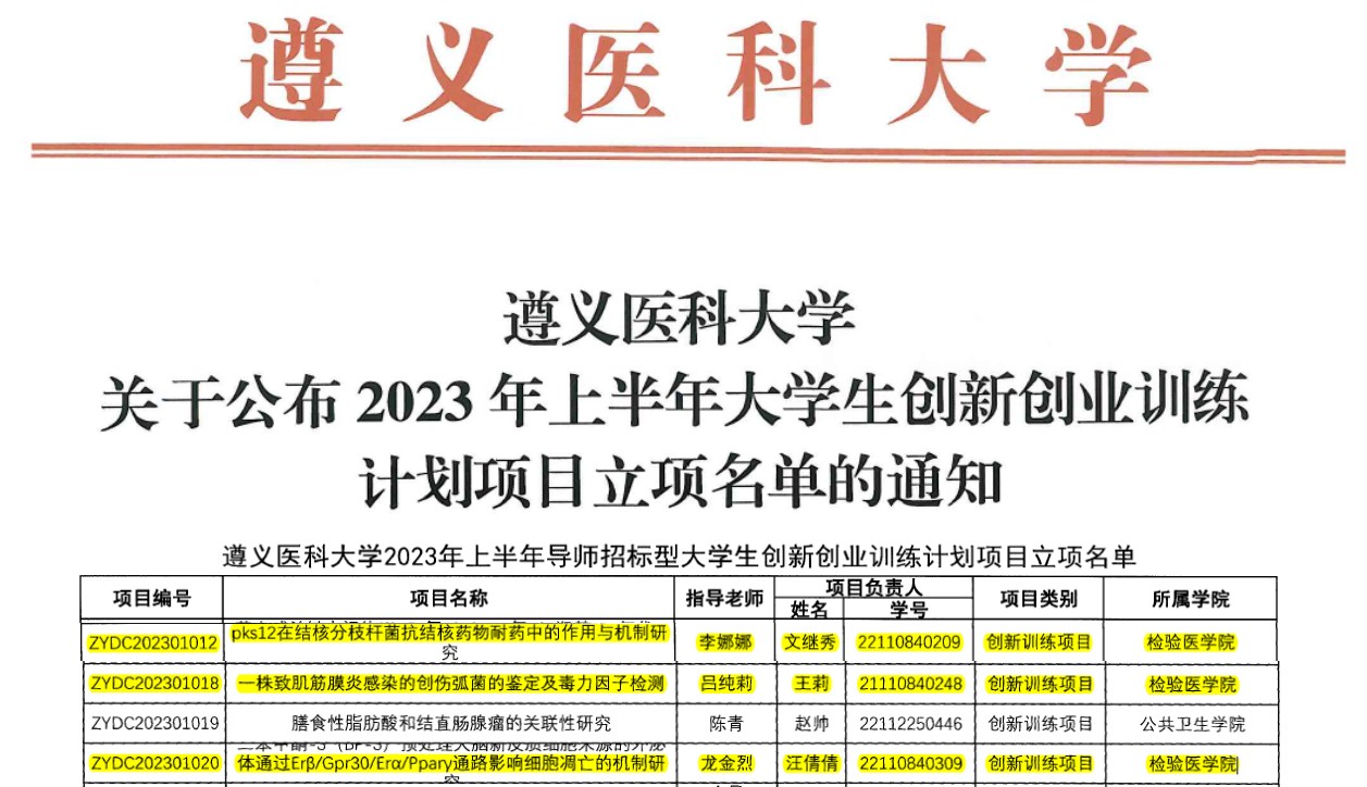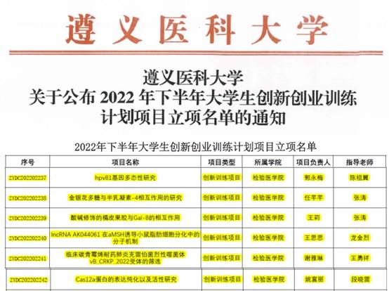 为继续深化创新创业教育改革,培养适应经济社会发展需要的创新型人才,尤其是进一步提高医学检验专业本科生科研创新思维与实验技能,tyc33455cc太阳成集团在院领导的高度重视下、众多带教老师的积极参与,努力推进老员工创新创业计划项目(大创)的开展,并于2022-2023学年内取得较好成绩。